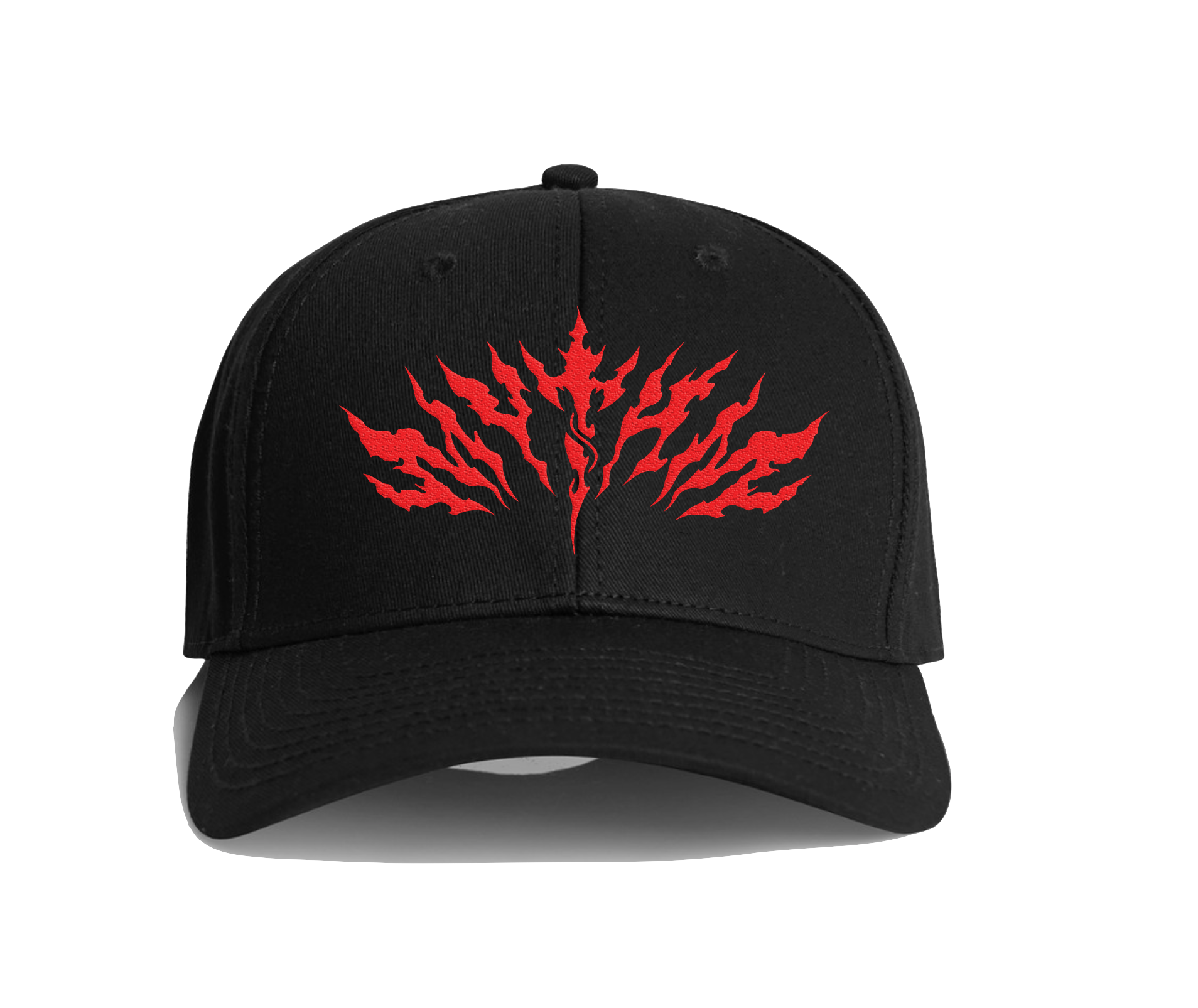Mid profile - six panel cap, curved peak with embroidered red MYTH logo.